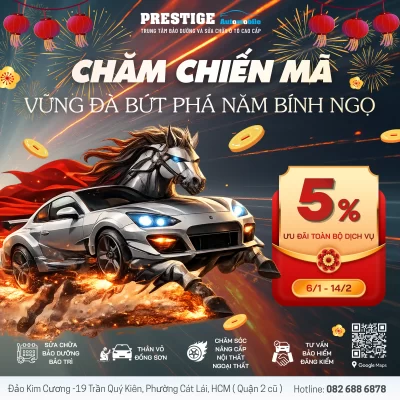 Prestige Automobile xin giới thiệu chương trình “CHĂM CHIẾN MÃ, VỮNG ĐÀ BỨT PHÁ NĂM BÍNH NGỌ 2026”. Tất cả các khách hàng tới Prestige Automobile từ ngày 6/1 – 14/2 đều nhận được ưu đãi 5% toàn bộ dịch vụ.