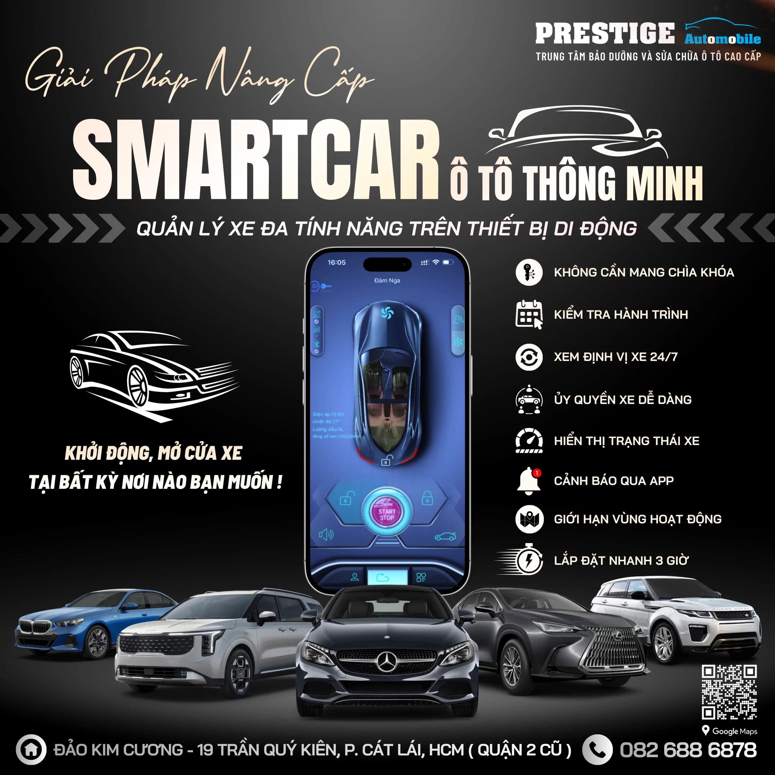 Bạn có cảm thấy mệt mỏi với việc tìm chìa khóa mỗi sáng? Hay lo lắng khi không biết “xế cưng” của mình đang ở đâu? Prestige Automobile xin được giới thiệu SmartCar – Giải pháp công nghệ đỉnh cao giúp chiếc xe của bạn thành một thiết bị thông minh, mọi quyền năng nằm gọn trong thiết bị di động! Với giải pháp nâng cấp SmartCar, chỉ với một chiếc điện thoại, bạn có thể kiểm soát toàn diện và dễ dàng chiếc xe của mình mọi lúc – mọi nơi – không giới hạn khoảng cách.