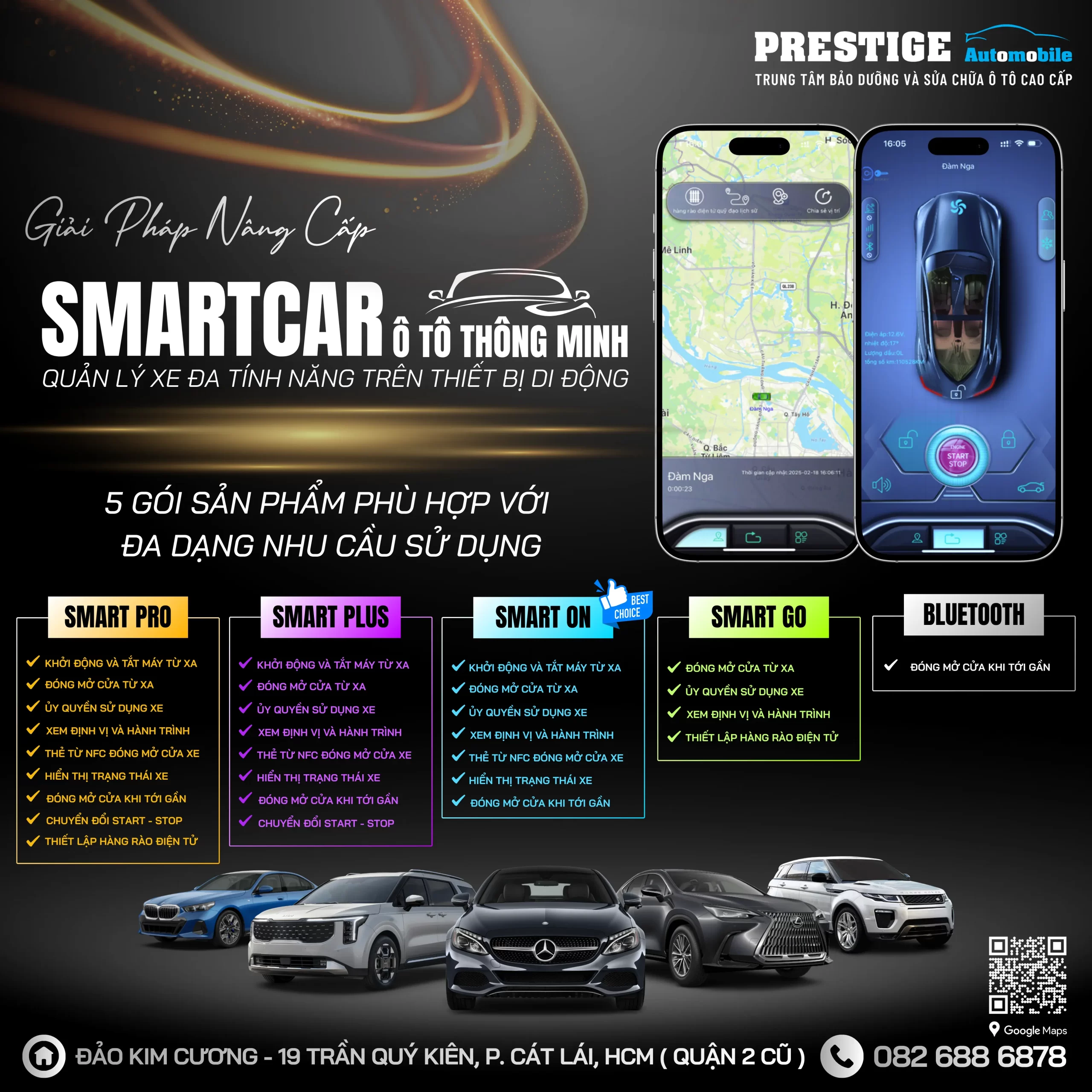 👉Prestige Automobile mang đến các Gói sản phẩm linh hoạt, từ cơ bản đến cao cấp, giúp bạn dễ dàng lựa chọn, bao gồm: BLUETOOTH / SMART GO / SMART ON / SMART PLUS / SMART PRO.